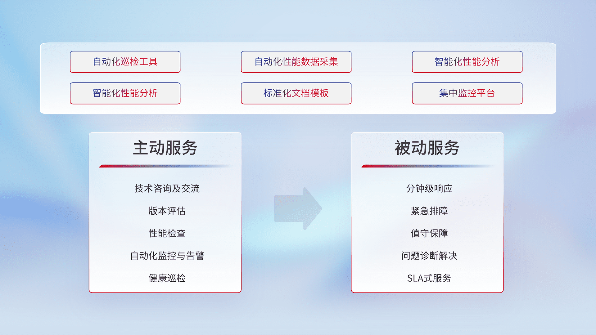 智能化工具和标准化文档,,保障服务质量,,,提供主动服务(包含技术咨询、、、、版本评估、、、、性能检查、、自动化监控与告警、、、、健康巡检)和被动服务包含(分钟级响应、、、紧急排障、、、、值守保障、、、、问题诊断解决、、SLA服务)。。